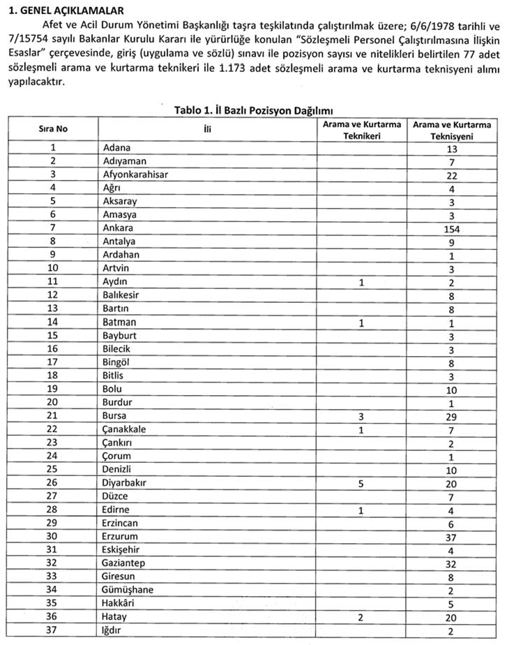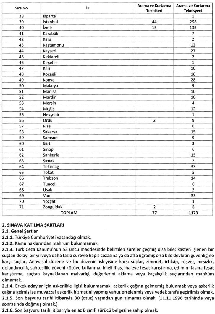İlana göre, alınacak personelin 77 sözleşmeli arama ve kurtarma teknikeri, 1173 arama ve kurtarma teknisyeni olacak.
