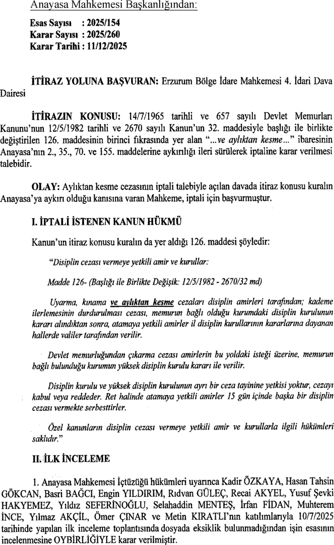 Karara göre, Erzurum Bölge İdare Mahkemesi, 14/7/1965 tarihli ve 657 sayılı Devlet Memurlan Kanunu’nun 12/5/1982 tarihli ve 2670 sayılı Kanun’un 32. maddesiyle başlığı ile birlikte değiştirilen 126. maddesinin birinci fıkrasında yer alan “...ve aylıktan kesme...” ibaresinin Anayasa’nın 2., 35., 70. ve 155. maddelerine aykınlığı ileri sürülerek iptaline karar verilmesi talep etti.