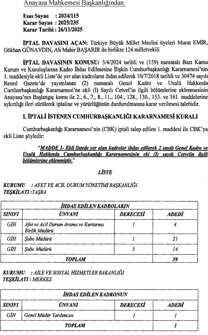 Resmi Gazete’nin 17 Mart 2026 tarihli sayısında yayımlanan karara göre, Yüksek Mahkeme, Milli Savunma Üniversitesi bünyesinde mali hizmetler uzmanı ve mali hizmetler uzman yardımcısı kadrolarının ihdas edilerek Cumhurbaşkanlığı Kararnamesi’ne eklenmesini konu bakımından yetki yönünden Anayasa’ya aykırı buldu.