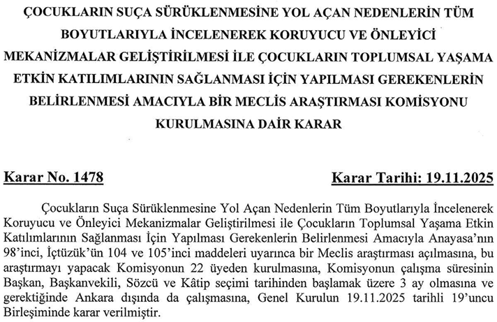 TBMM'nin, "Çocukların Suça Sürüklenmesine Yol Açan Nedenlerin Tüm Boyutlarıyla İncelenerek Koruyucu ve Önleyici Mekanizmalar Geliştirilmesi ile Çocukların Toplumsal Yaşama Etkin Katılımlarının Sağlanması İçin Yapılması Gerekenlerin Belirlenmesi Amacıyla Bir Meclis Araştırması Komisyonu Kurulmasına Dair Kararı' Resmi Gazete'de yayımlandı.