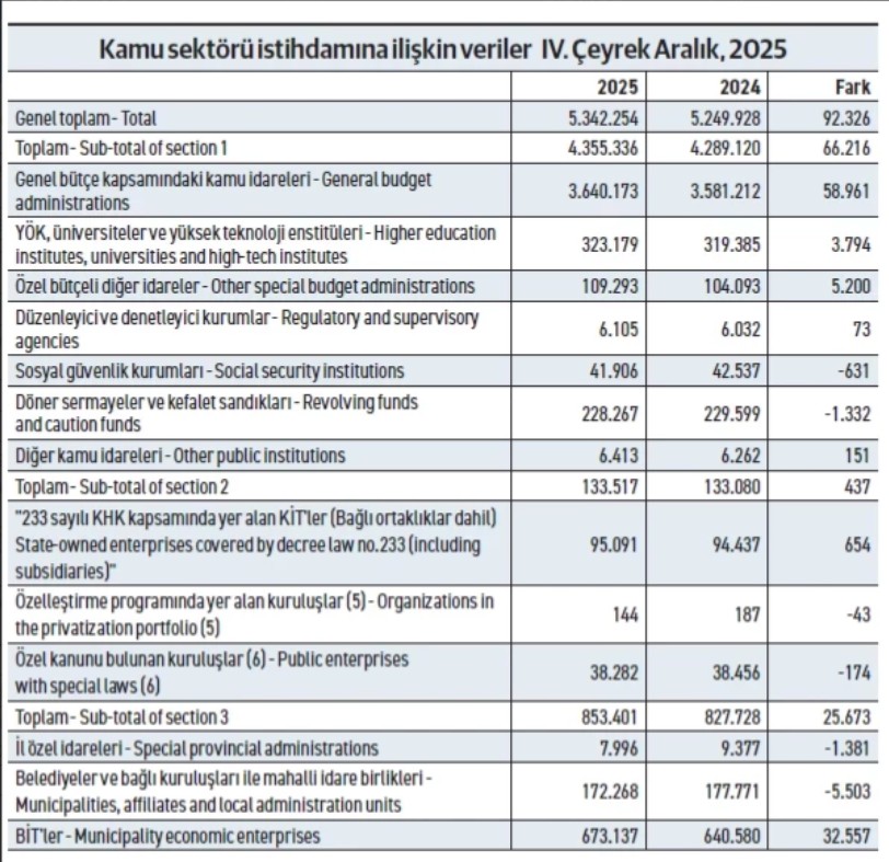 Buna göre, kamuda çalışan memur ve işçi sayısı 2025 yılı sonu itibariyle 92 bin 326 kişi artarak 5 milyon 342 bin 254 kişi oldu. 2024 yılında ise bu sayı 5 milyon 249 bin 928 kişiydi.