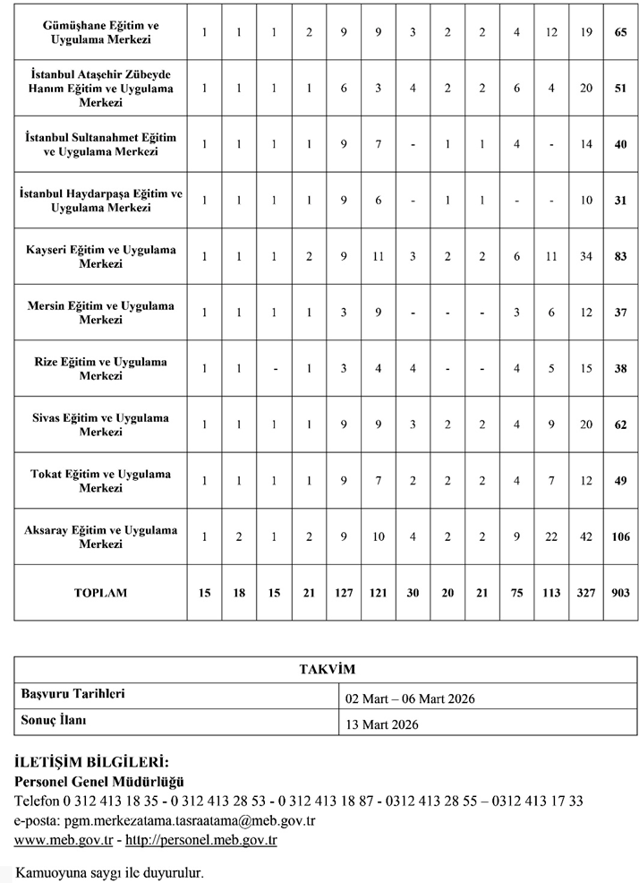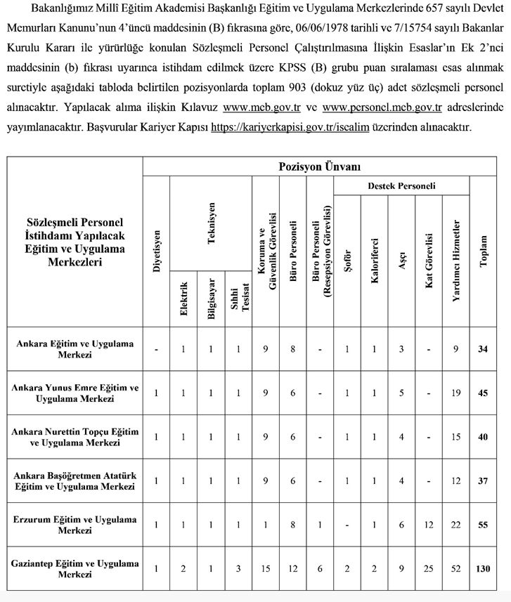 Milli Eğitim Bakanlığı'nın Resmi Gazete'de yayımlanan ilanına göre, Ankara, İstanbul, Erzurum, Gaziantep, Gümüşhane, Kayseri, Mersin, Rize, Sivas, Tokat, Aksaray'daki eğitim ve uygulama merkezlerinde görevlendirmek üzere 903 sözleşmeli personel alacak.