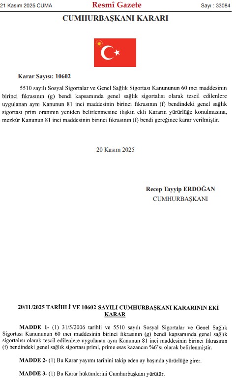 Genel Sağlık Sigortası Prim oranları Asgari ücretin % 3 ü üzerinden alınmakta iken bu oran Cumhurbaşkanı Kararı ile % 6'ya çıkarılmıştır. Buna göre ödenecek aylık GSS primi 26.005,50*% 6 = 1.560,33 TL olacaktır.