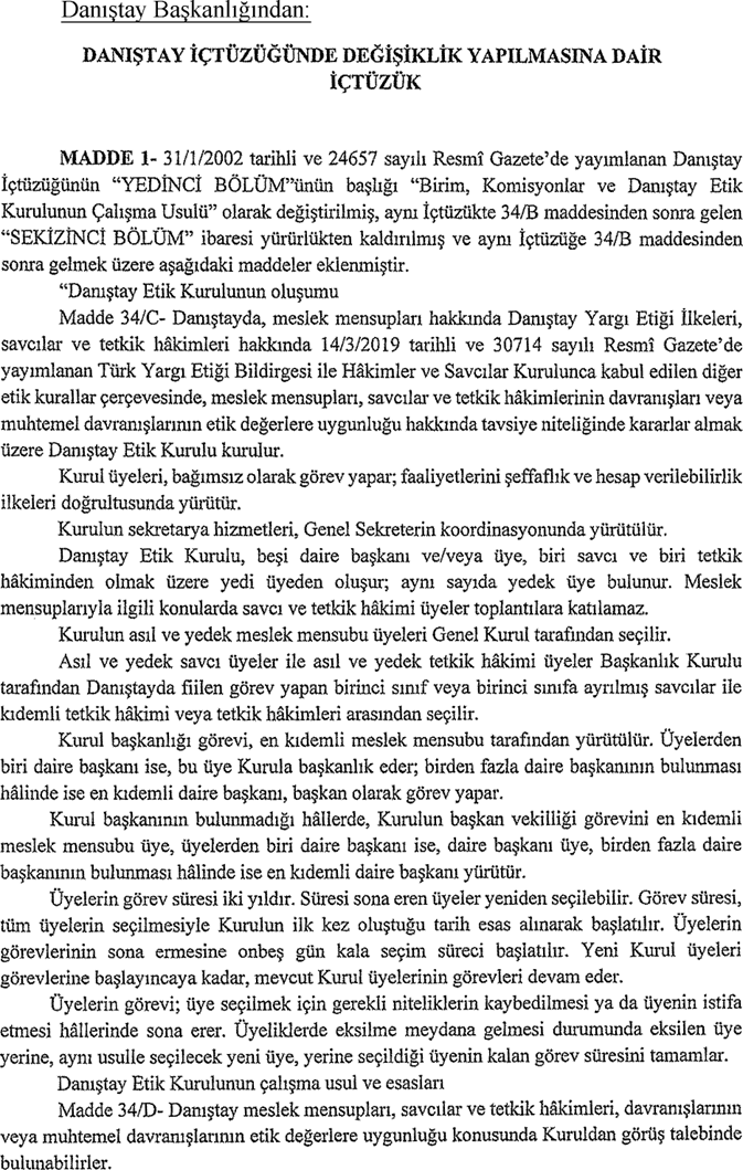 Danıştay'da Etik Kurulu oluşturulmasına ilişkin düzenleme şöyle: