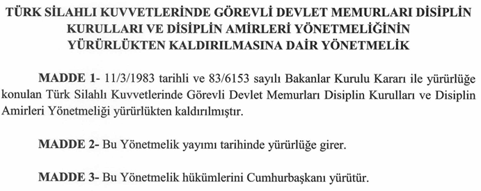 Resmî Gazete’de yayımlanan kararla, Türk Silahlı Kuvvetleri’nde görev yapan devlet memurlarının disiplin kurulları ve disiplin amirlerini düzenleyen, 1983’ten bu yana yürürlükte olan yönetmelik kaldırıldı.