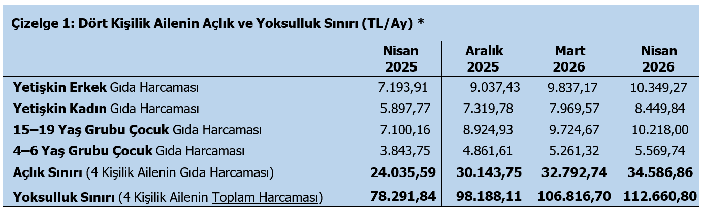 Buna göre, nisanda açlık sınırı 34,6 bin TL’ye, yoksulluk sınırı 112,7 bin TL’ye yükselirken, mutfak enflasyonu aylık yüzde 5,47 oldu.
