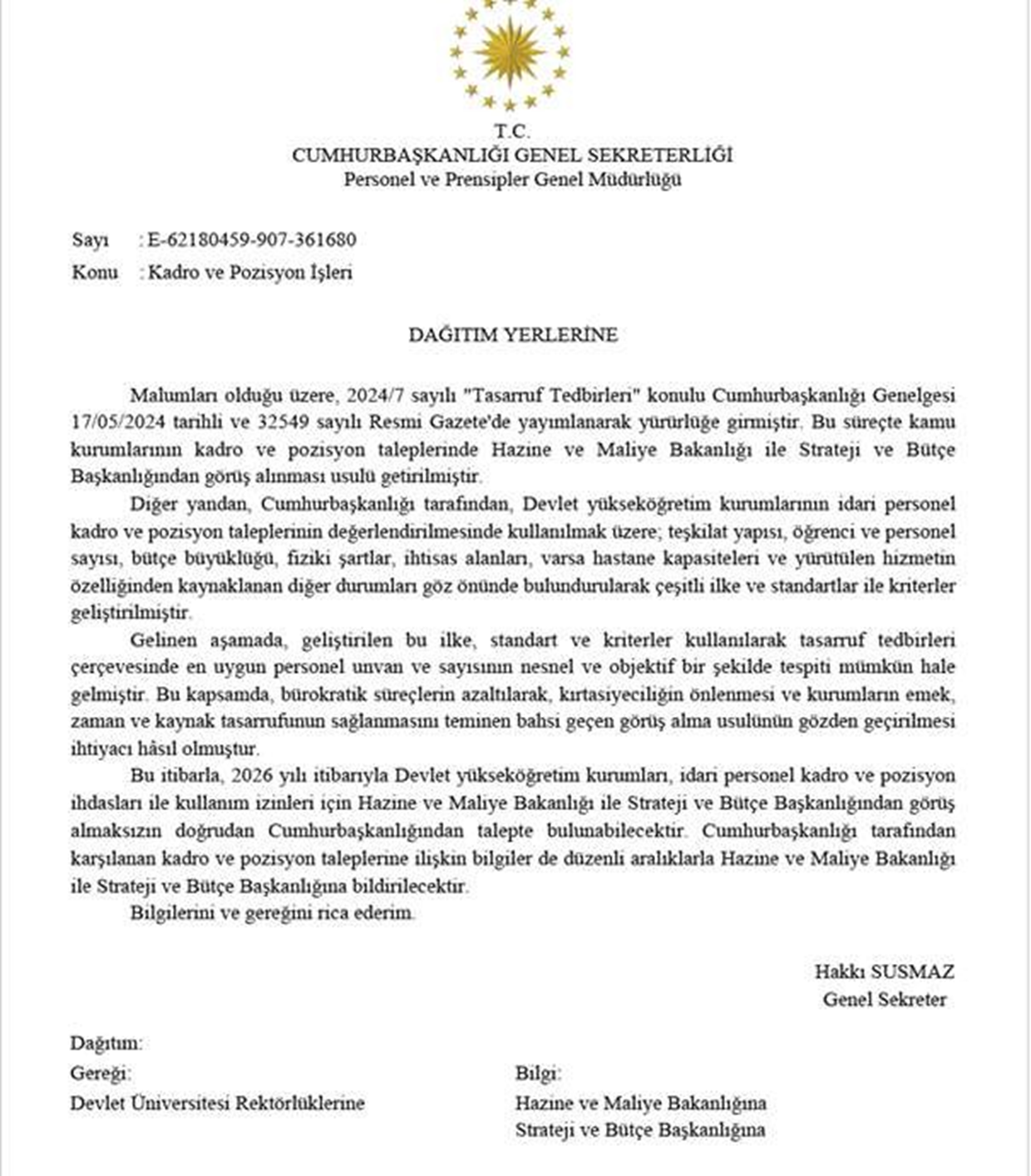 Cumhurbaşkanlığı'ndan üniversitelere gönderilen yazı şöyle: