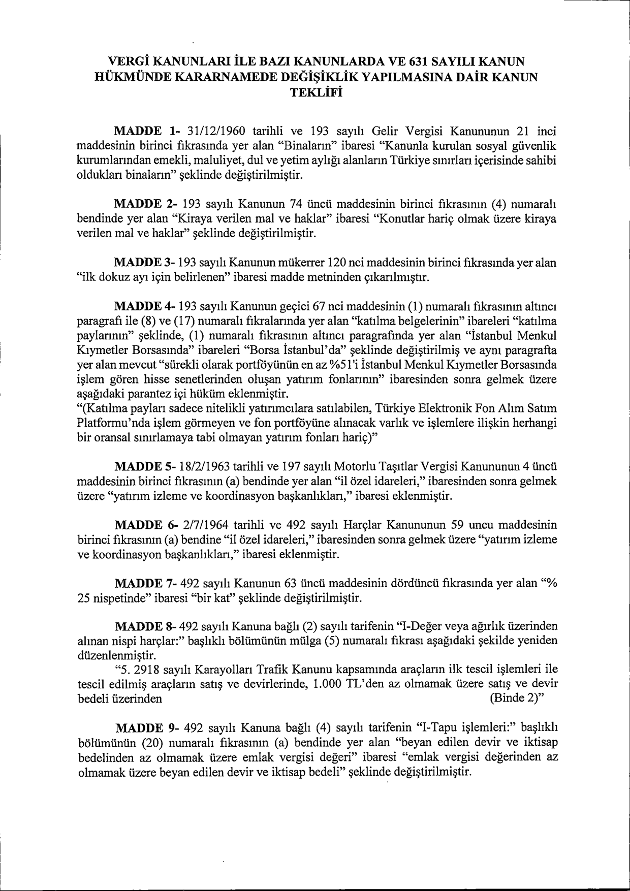 Gelir vergisinden MTV’ye, tapu harçlarından bireysel emekliliğe kadar birçok alanda yeni düzenleme yolda. AK Parti milletvekillerinin imzasını taşıyan “Vergi Kanunları ile Bazı Kanunlarda Değişiklik Teklifi” TBMM’ye sunuldu.