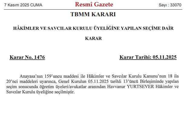 TBMM Genel Kurulu tarafından 24.11.2021 tarihinde Hâkimler ve Savcılar Kurulu üyeliğine seçilen Havvanur YURTSEVER tekrar seçilmiştir.