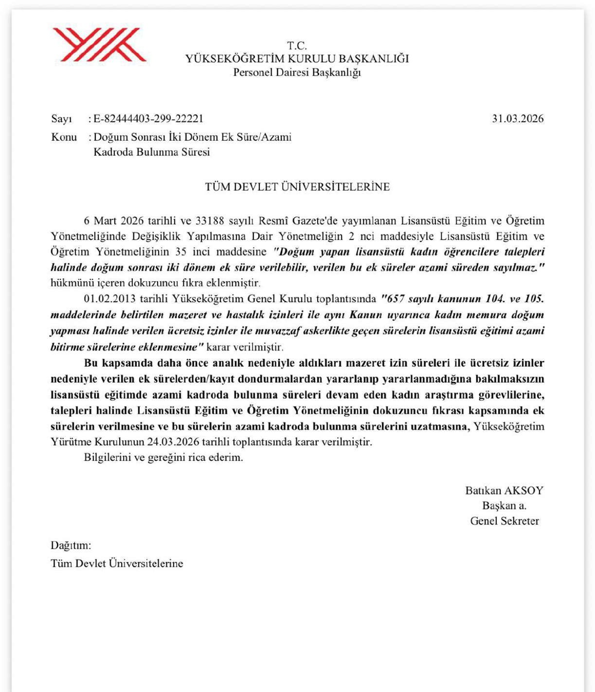 Yazıya göre, doğum yapan lisansüstü öğrencilere ve kadın araştırma görevlilerine talepleri doğrultusunda 2 dönem ek süre hakkı sağlanacak. Verilen bu ek süreler, öğrencinin mezun olması gereken azami süre hesaplamasına dahil edilmeyecek.